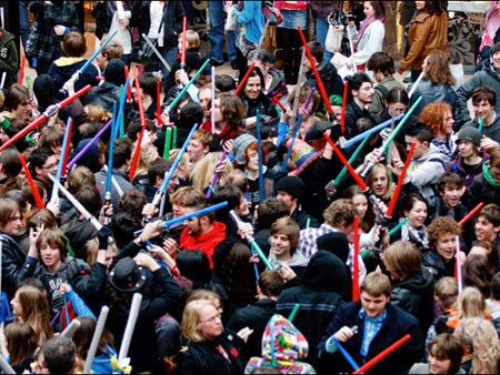 O encontro foi organizado por fãs ingleses do filme Guerra nas Estrelas e ocorreu no shopping Cabot Circus, que fica centro de Bristol, sudoeste da Inglaterra. Eles marcaram o evento pelo Facebook. Centenas de sem-noção e maluquetes apareceram com sabres de luz no última dia 13 de fevereiro.